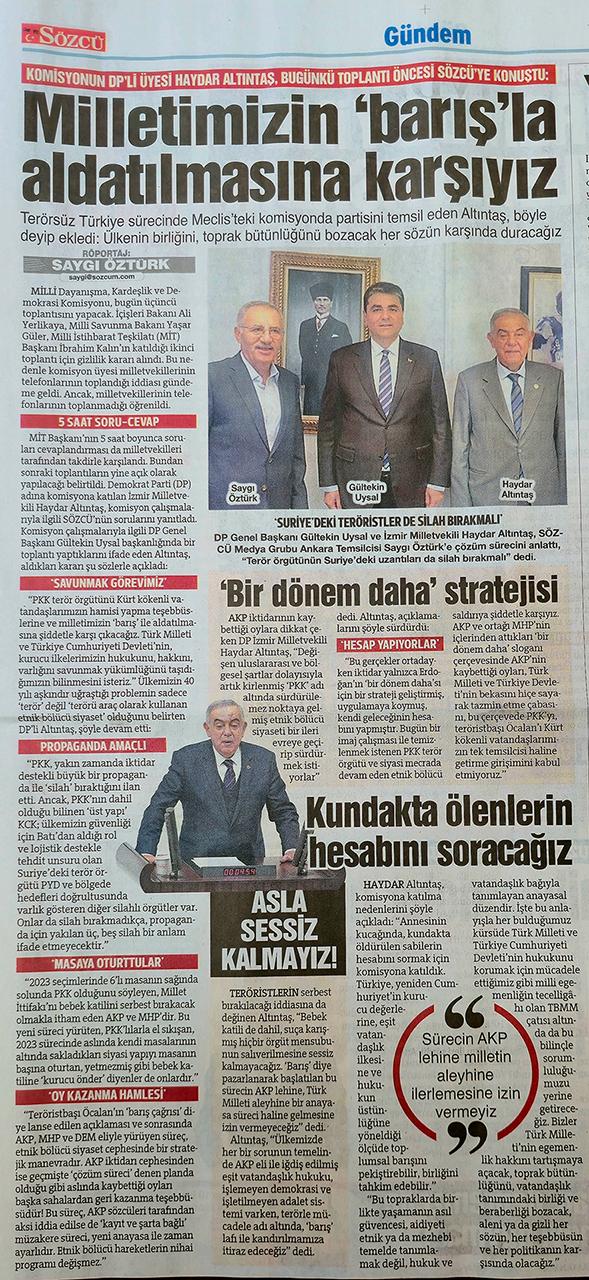 Demokrat Parti Sözcüsü ve İzmir Milletvekili Haydar Altıntaş: Milletimizin barışla aldatılmasına karşıyız. Ülkenin birliğini, toprak bütünlüğünü bozacak her sözün karşısında duracağız.